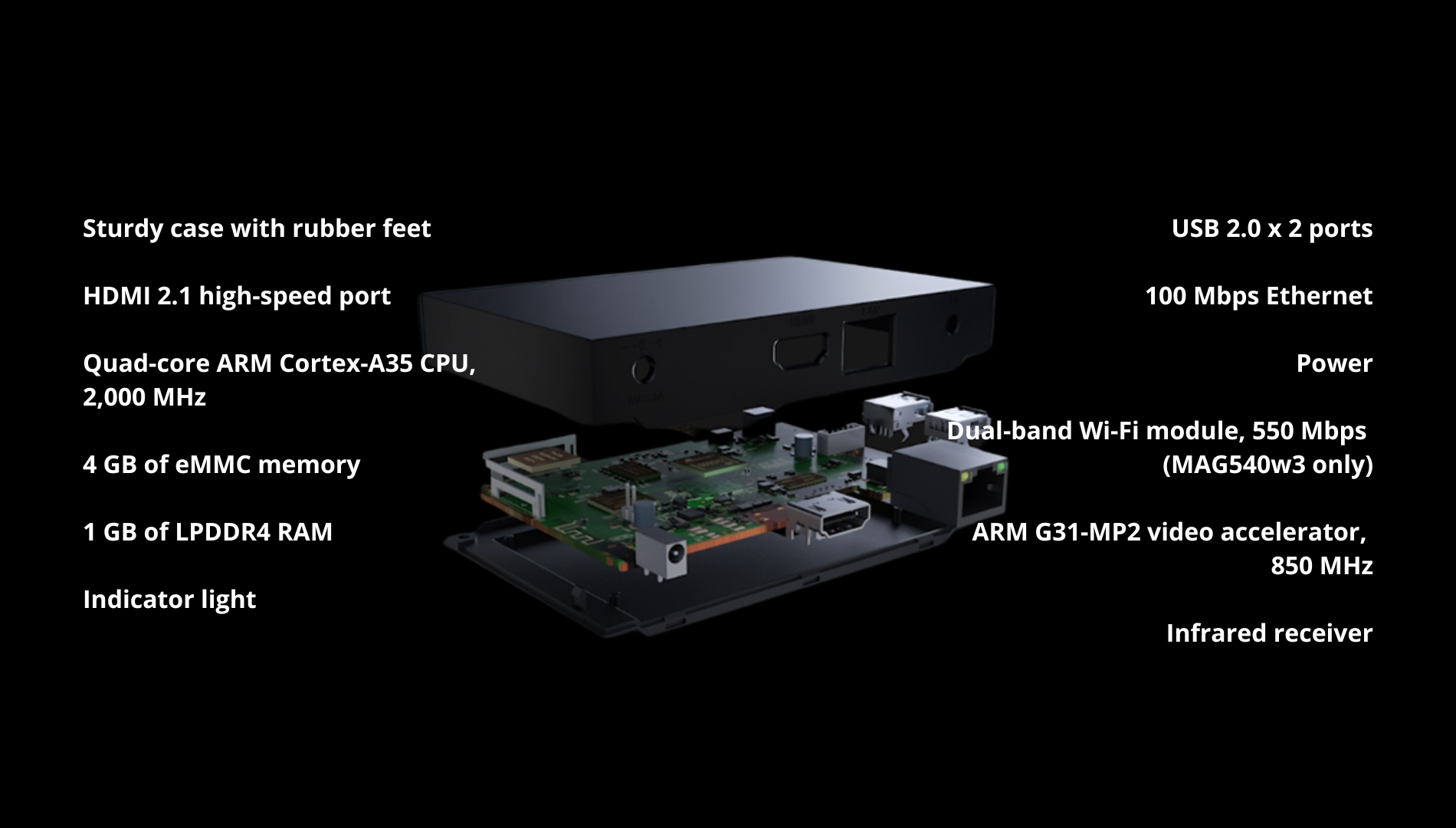 MAG540 and MAG540w3 are Linux STBs powered by the quad-core ARM Cortex-A35 CPU with a brand new Amlogic S905Y4 chipset. This hardware makes the model much more powerful than the legacy STBs. The devices ensure easy and smooth playback of content in all popular modern video formats, including 4K.